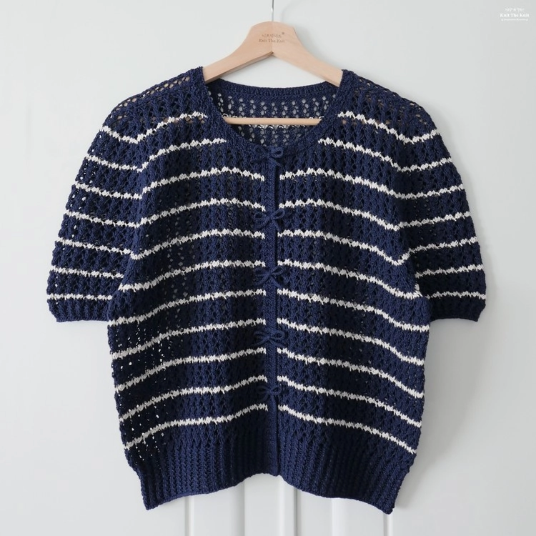 ‘버블리 카디건’은 새들 숄더를 이용한 셋 인 슬리브 구조의 탑다운 카디건으로, 보글보글 물방울이 올라오는 이미지를 떠올리며 디자인한 비침 무늬 ‘보글 스티치’와 줄무늬 배색을 조합해 시원한 느낌이 매력적인 디자인입니다.