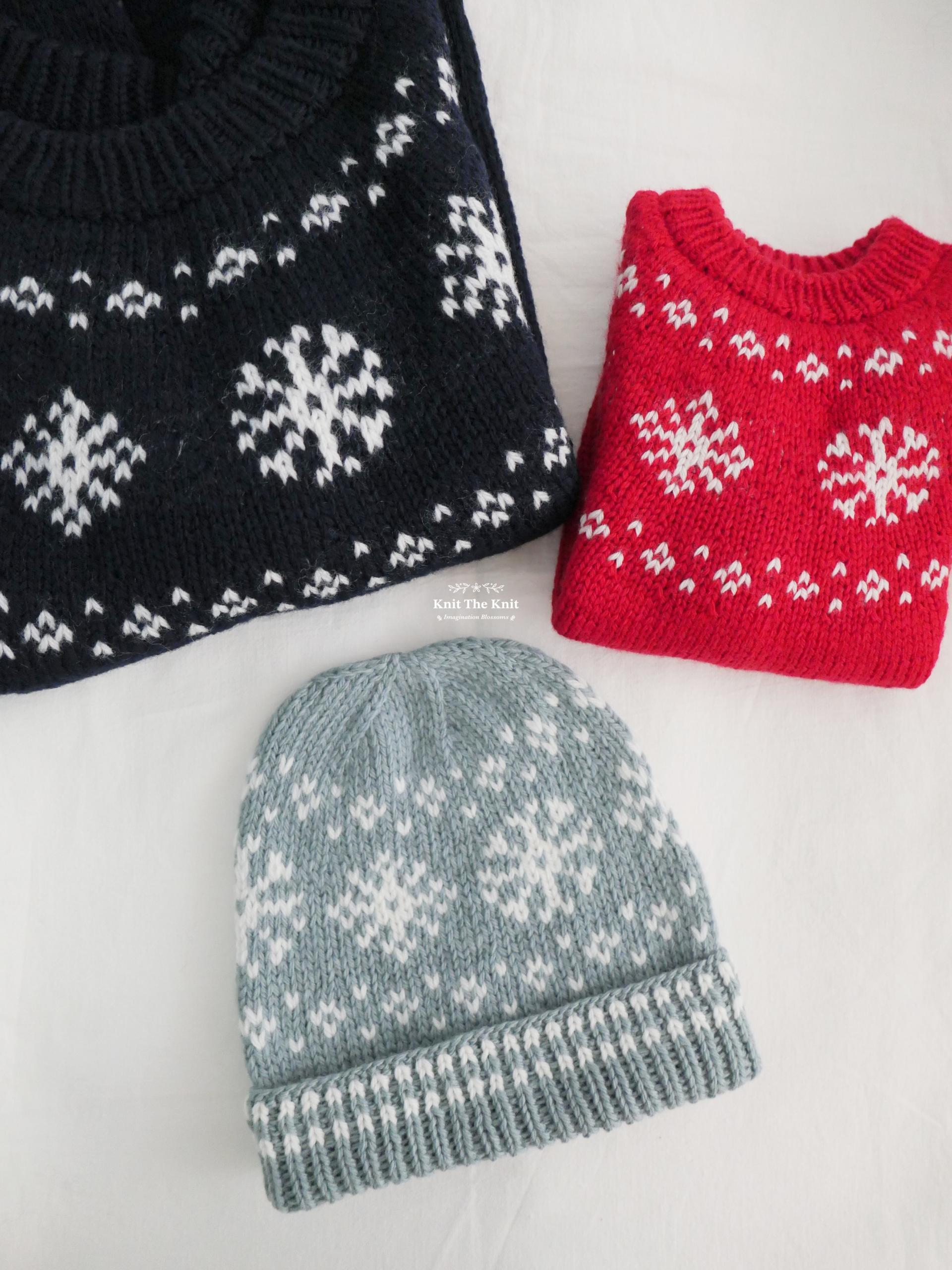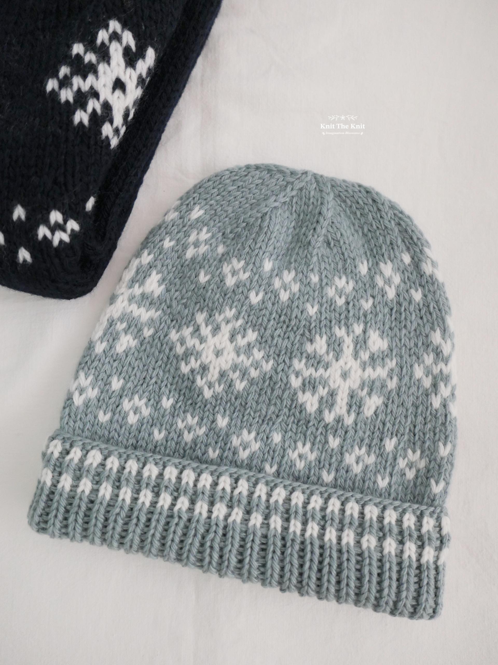 디자인의 중심이 되는 배색 패턴은 눈꽃과 내리는 눈을 표현한 것으로, 2색 가로 배색 뜨기로 작업합니다.
