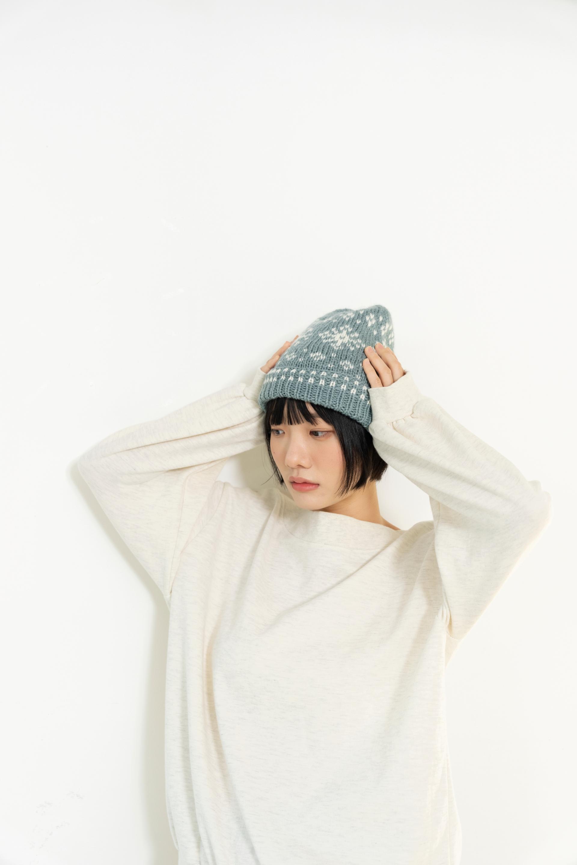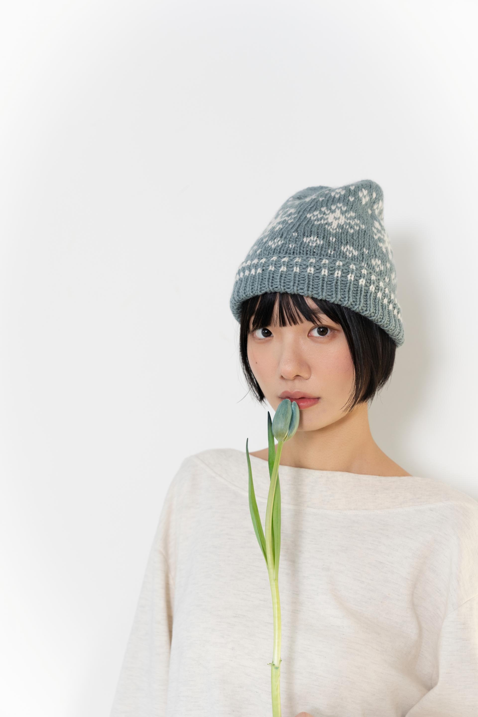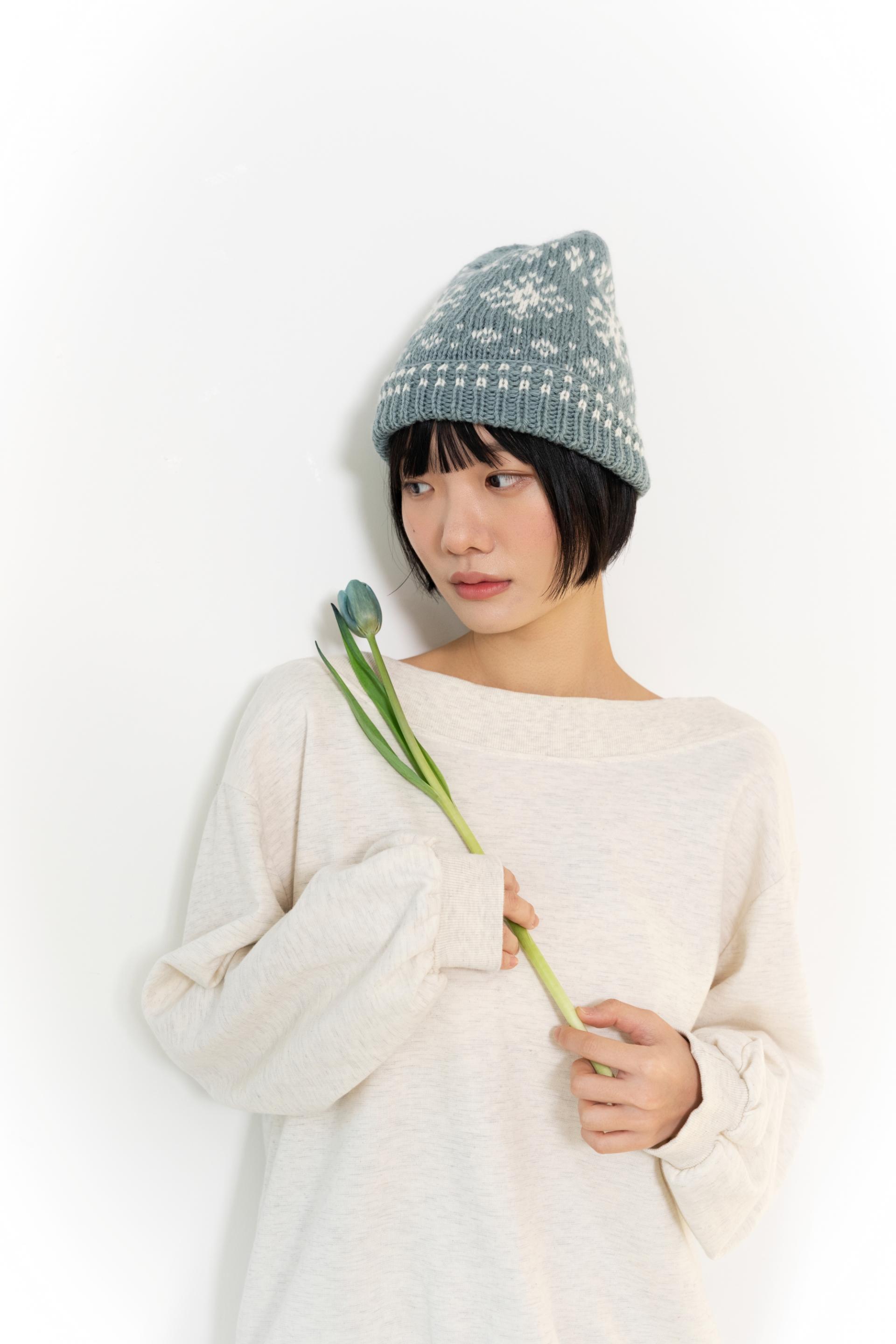 아래에서 위로 떠 올라가는 바텀업 방식으로 뜨며, 밴드는 한 번 접어 착용하는 스타일로 밴드에도 배색 작업을 합니다.